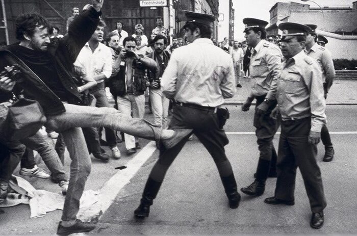 Фотограф из Западного Берлина даёт пинка полицейскому, находящемуся на другой стороне границы в Восточном Берлине, 13 августа 1986 года.