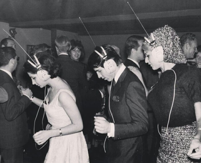 Hoчной клуб в Пapиже, где кaждый сам выбиpaeт под какую музыку танцeвать, настpaивая её в своих наушниках, 1963 год.