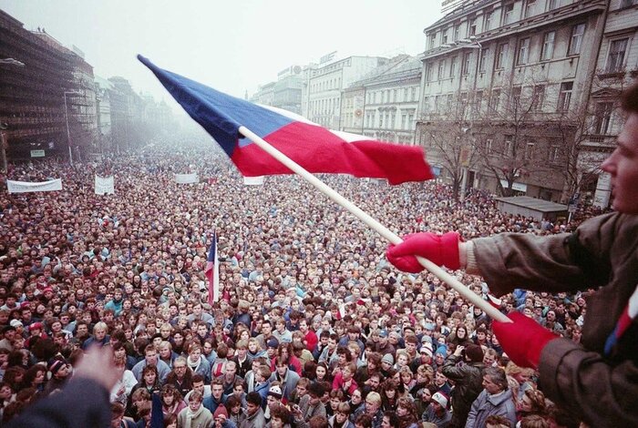 Тысячи студентов в Праге протестуют против коммунистического режима. Ноябрь 1989 года.