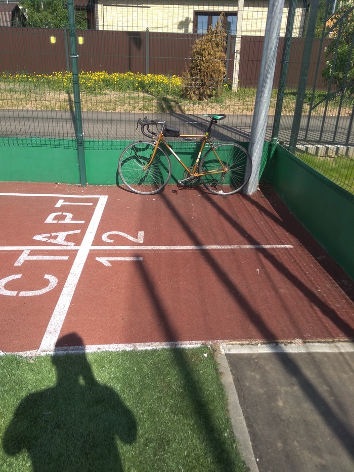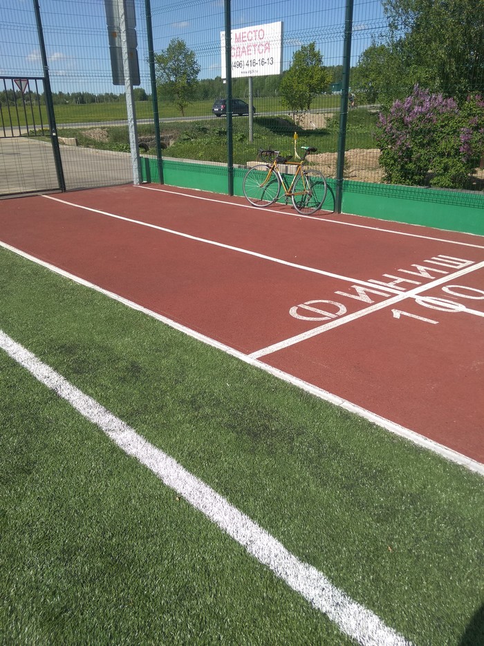 Ниже фото стометровки, для понимания размеров велосипед, на старте и финише. Тормозите в забор) Есть ещё снаряды спортивные сделанные для детей, с моим ростом 185 на брусьях не хватает хвата, мне реально не отжатся. Да и баскетбольную и волейбольную площадку впихнули с краю.