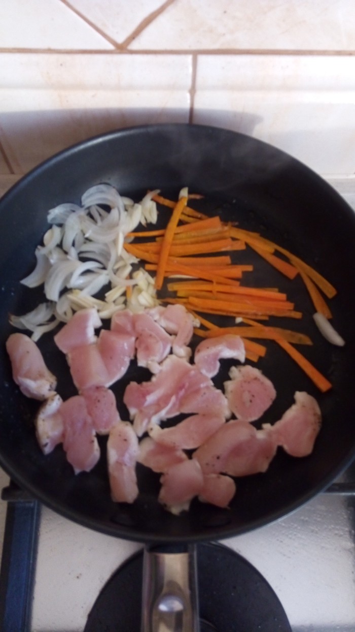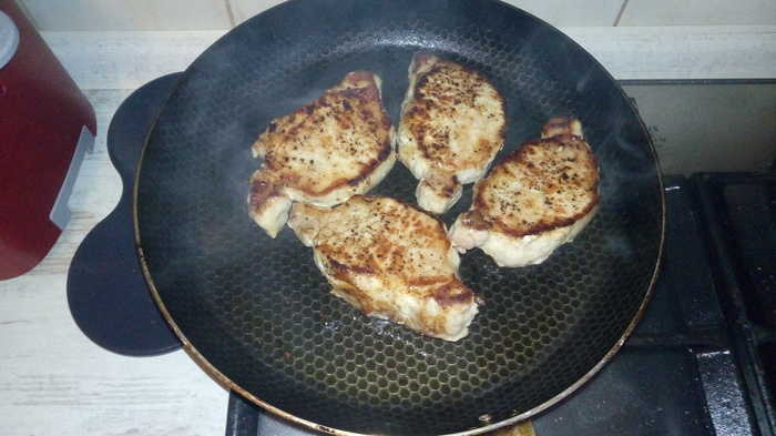 Которой тут не видно) Из мяса начнет выходить вода, ничего страшного, прикройте крышкой, но неплотно, чтоб выпаривалась вода, как только мясо перестанет истекать водой кидаем туда же грибы