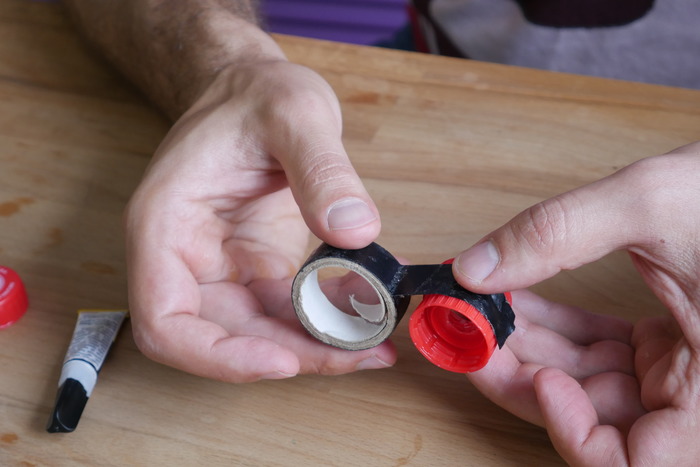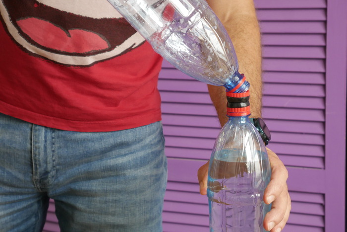 Понадобится: две бутылки, что-то чем сделать большие отверстия в крышках (нож, дрель), что-то чем их надёжно соединить (изолента, клей, при сноровке сойдёт и пластилин).