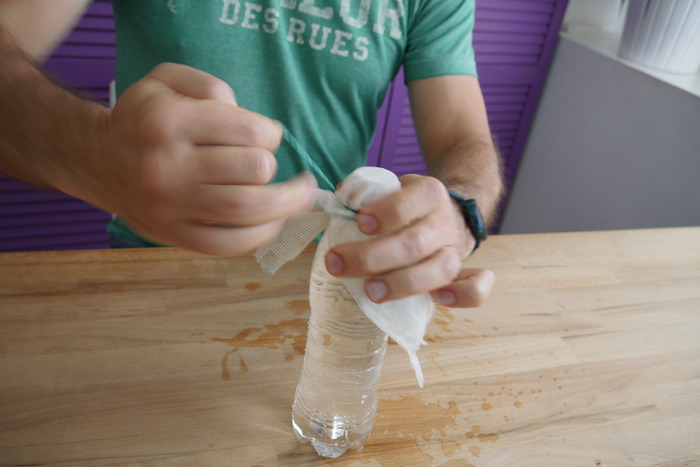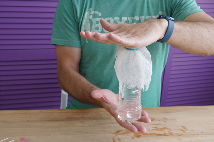Нужны бутылка и сетка (бинт, москитная, да и носок на крайний случай подойдёт). Бутылку удобнее стеклянную, пластиковая может сминаться. Ещё пригодятся зубочистки.