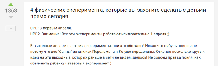 Почти полгода назад я случайно наобещал, что сделаю классную подборку экспериментов (и даже не одну), которые можно провести дома вместе с детьми.