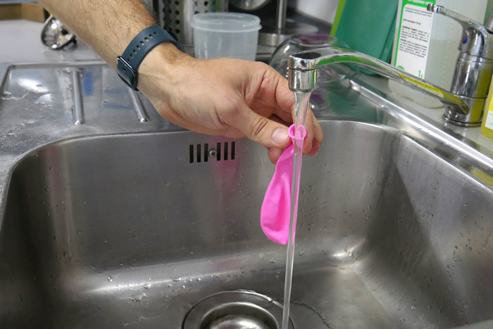 В момент переворота вода будет выливаться, если не накрыть горлышку ладонью. Сначала переворачиваем - потом отпускаем!