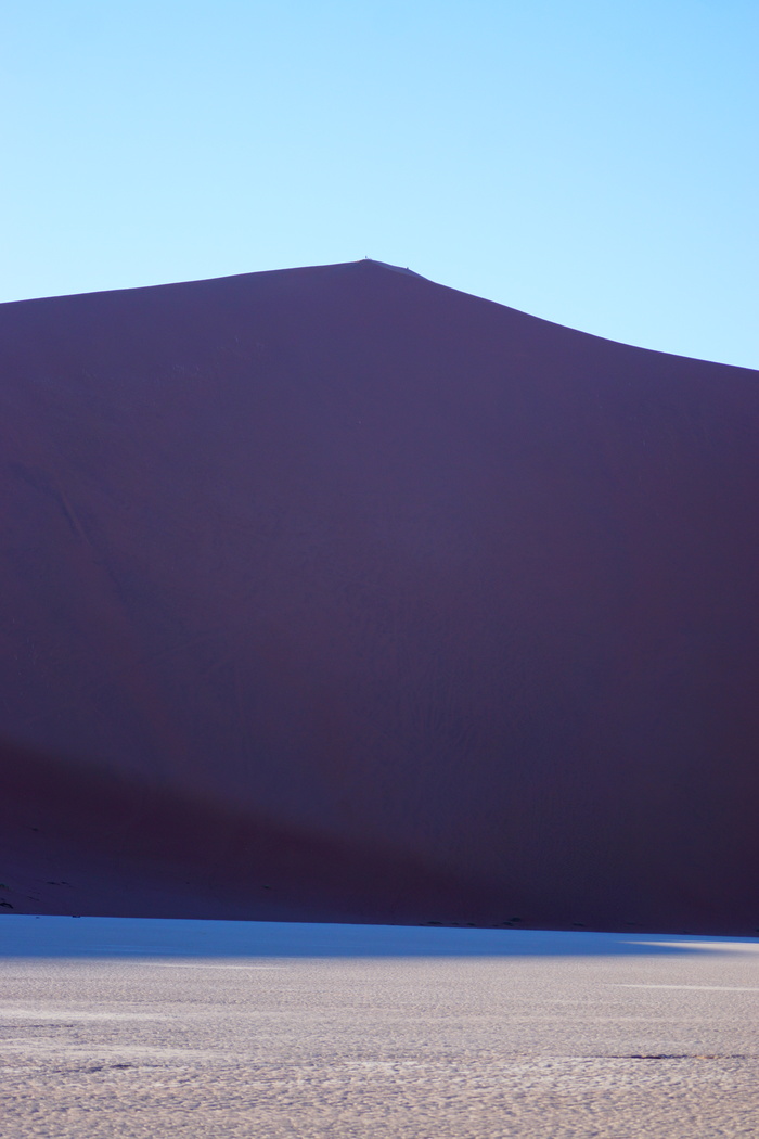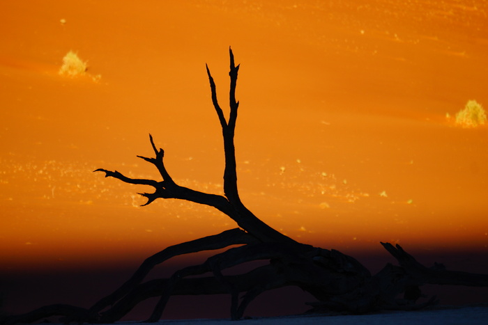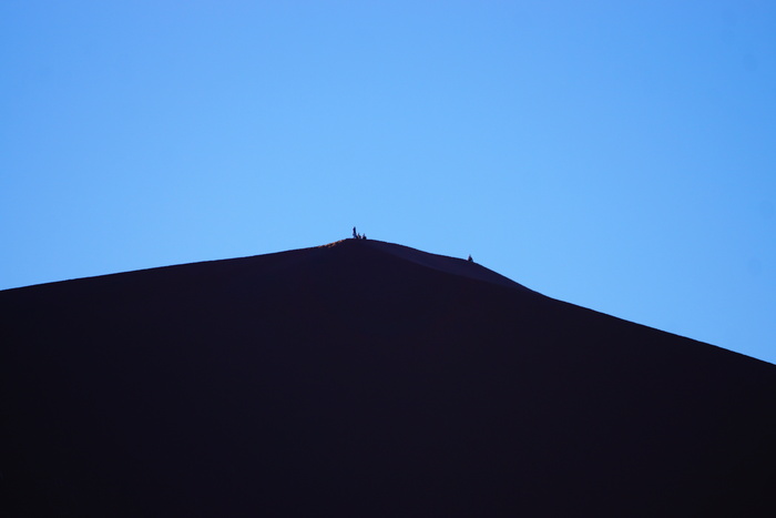 Мы решили, что нам интереснее все-таки увидеть восход солнца в долине, поэтому наверх не пошли. Теоретически можно совместить оба этих события: подняться наверх, встретить восход, а потом за 2-3 минуты сбежать по склону на дно долины (при определенной сноровке можно даже шею не свернуть), но это осуществимо только в том случае, если остановиться в каком-нибудь лодже в непосредственной близости от Deadvlei, так как в кэмпе ворота открываются не раньше 6 утра и просто не хватит времени доехать до места назначения и взобраться на вершину дюны: подниматься по песку ой как непросто!