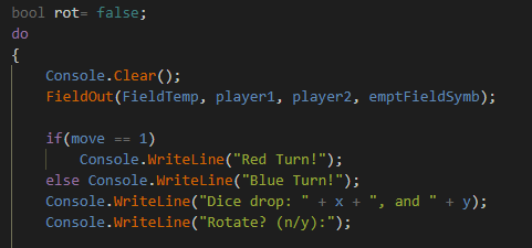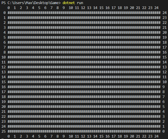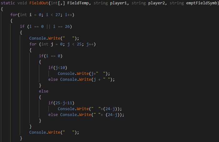 Уже выглядит неплохо! (в ширину одна клетка - теперь 2 символа) Но встает другой вопрос, когда мы игрок 2, нам нужно сначала посчитать куда вообще ставить, если у игрока 1 это вначале 0 и 0, то у второго первый ход вышел на 24 и 22, что не дело, надо сделать вычитание для игрока 2 (25 минус кость). и лучше будет сделать сначала вывод поля, а потом спрашивать куда ставить, для наглядности).