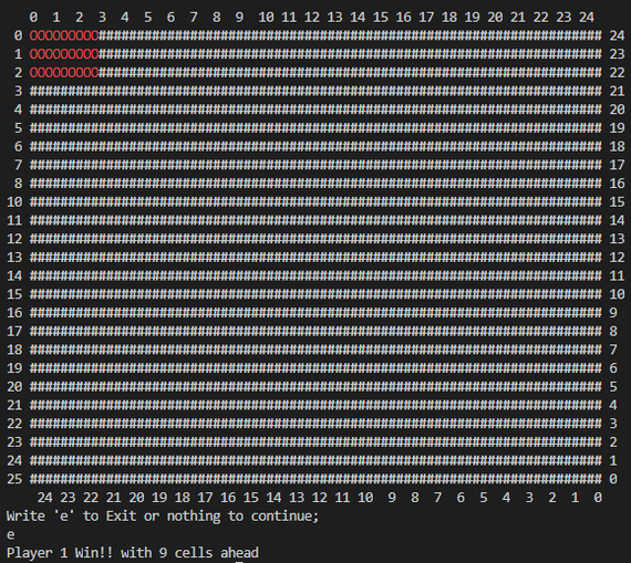 При желании можно еще подкрутить выход при окончании места на поле, защиту от неправильной установки блоков, ASCII движ. и норм отображение, а так же вывод победителя, но это уже как-нибудь в другой раз)