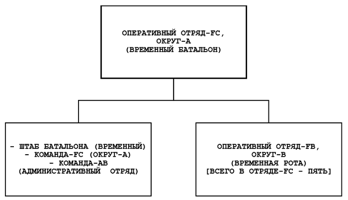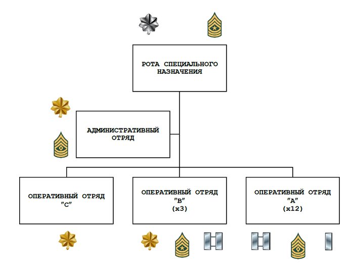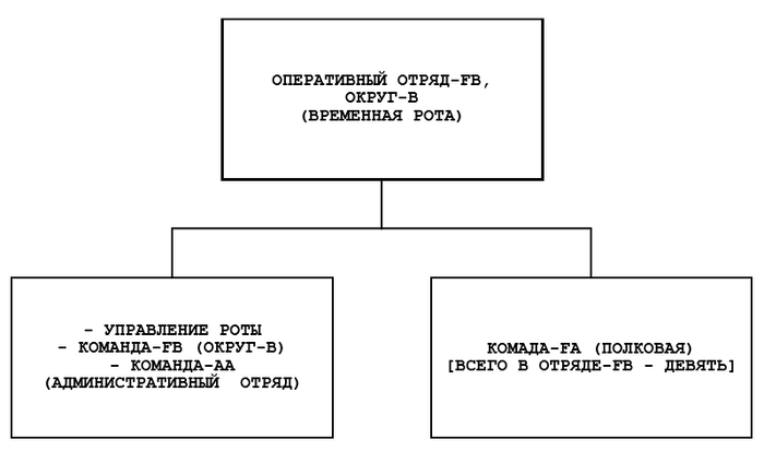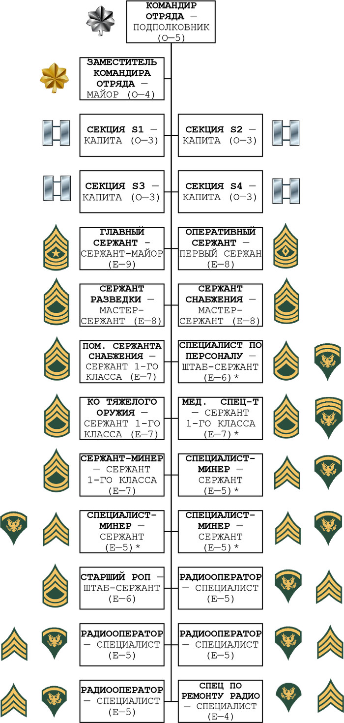 1. Команда-АА, административный отряд – рота (Team AA, Administrative Detachment, Company). Эта команда, прикрепленная к команде-FB, обеспечивает необходимый порядок и управление для девятью и более командами-FA. После того, когда оперативная команда готова к действиям, команда-AA становится более эффективной в выполнении управленческих функций. [1 офицер и 12 сержантов. ВСЕГО - 13 в/сл-х]