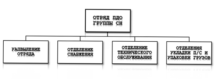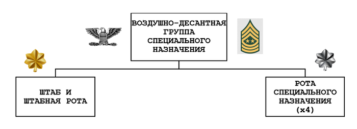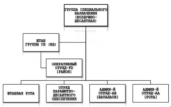 Группа специального назначения (воздушно-десантная) состоит из - штаба и штабной роты, отряда парашютно-десантного обеспечения (укладки парашютов) специального назначения, необходимого числа административных команд и предписанного числа оперативных отрядов.