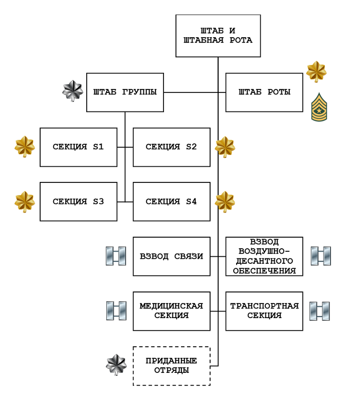 3. Комендант штаба (Headquarters Commandant). Комендант штаба - командир штабной роты группы. Он выполняет свои обязанности при содействии личного состава штабной роты.