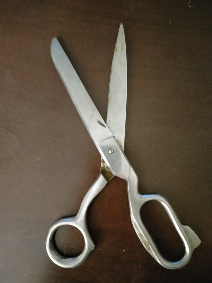Итак, берём обычный нож. Портняжные ножницы, которые достались от бабушки (Царство ей небесное) и точим ножницами нож ))