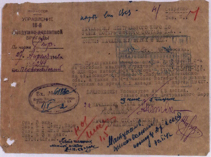 Уже согласно этому, первому, документу, любому профессиональному исследователю должно стать ясно, что в тот день 18 ВДБр лишилась всего своего командования — в списке погибших командиров одновременно значились врид комбрига, военком и врид НШ. Удивительно, но факт: единственная резолюция на данном документе — "В алфавит внесены" с подписью неустановленного лица — была наложена на этот документ только... спустя два с лишним месяца — 12 марта. Ещё через полтора месяца — 27 апреля 1942 года — в штабе бригады, наконец, озаботились отправкой "наверх" списка военнослужащих 18 ВДБр, погибших ещё четыре месяца назад, который включал теперь уже 261 имя и составлялся, очевидно, путём опроса уцелевших при катастрофе 30 декабря 1941 года. В сопроводительном документе всё то же, новое руководство Штаба бригады, писало, в частности, следующее: