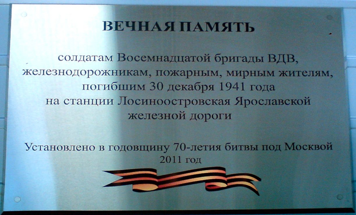 Ещё один объект увековечение памяти жертв этой катастрофы находится в одном из новых строений железнодорожной станции Лосиноостровская, расположенном при входе на платформу "на Москву". Это — металлическая мемориальная доска с текстом: "Вечная память / солдатам Восемнадцатой бригады ВДВ, / железнодорожникам, пожарным, мирным жителям, / погибшим 30 декабря 1941 года / на станции Лосиноостровская Ярославской / железной дороги / Установлено в годовщину 70-летия битвы под Москвой / 2011 год" и цветным рисунком "георгиевской" ленточки под ней. Эта доска была торжественно открыта 14 ноября 2011 года при участии того же неутомимого Н.И.Ивина (к сожалению, вскоре после этого ветеран скончался, не дожив ни до своего 87-летия, ни до 70-летия катастрофы на станции Лосиноостровская, последним из невольных свидетелей и участников которой он являлся...). Спустя два с половиной года, 12 мая 2014 года эта памятная доска была торжественно открыта вторично — на этот раз в новом оформлении. Теперь она была закреплена не просто на "сайдинге" внутреннего зала станции, как это было сделано первоначально, а на большом "планшете" с надписью "Никто не забыт / ничто не забыто" и изображением Ордена Победы над ней, ниже металлической доски постоянно прикреплены искусственные цветы, перевитые "георгиевской" ленточкой, а под ними установлена полочка для возложения к доске цветов живых. В самом низу этой мемориальной композиции размещена табличка с текстом: "Памятная мемориальная доска установлена / Московско-Курским региональным обособленным / подразделением Дорпрофжел на Московской / железной дороге" и цветным рисунком эмблемы "Дорпрофжела" — Дорожной территориальной организации Российского профессионального союза железнодорожников и транспортных строителей на Московской железной дороге. В заключение нашего рассказа об этой доске, стоит с сожалением отметить, что ни на первое, ни на второе её открытия на станцию Лосиноостровская почему-то так и не были приглашены представители ни ветеранских организаций ВДВ, ни нынешнего командования Воздушно-десантных войск Российской Федерации.