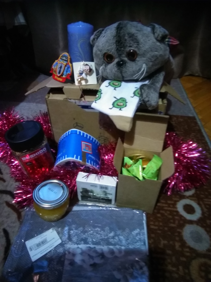 Так-с...что тут такое?! Чай! Люблю! Кофе! Обожаю! Конфетки и шоколадные медальоны! Теряю рассудок! Полотенца с фантастически красивыми зимними пейзажами! Мыльные с натуральными маслами! Теплые носочки! Магнит на холодильник с фотографиями г. Старицы! Брошь Медсестра со шприцем (ля-ля-ля! Приколю на форму!)!!! Мёд натуральный! Буду пить с чаем длинными зимними вечерами! Мишура новогодняя свеча для волшебного настроения! И открытка! От самого Деда Мороза!!! Спасибо, Дедушка Мороз из Тверской области!!! Всё так классно!!! Здоровья Вам!!! Всех благ!