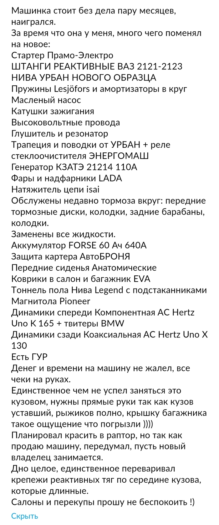 Сразу хотел бы оговориться, покупал не первым авто. Нужна была рабочая лошадка. Перевезти - отвезти. Ну и для транспортировки собаки. Так как был подбор приоры универсал, пост был ранее, понял что живую поймать вряд ли удастся. Бюджет был тысяч 500 край. Вспомнил - что со студенческих времен хотел попробовать Ниву. Почему бы и нет? И начал искать. Посмотрев Нивы до обозначенного бюджета немного приуныл. Откровенное гнилье с проблемами по технике. Было дело уже успокоился, но...решил ограничить бюджет поиска до 300 тысяч. Как говорится "хотя бы не жалко". И вот в один из дней попался неплохой вариант по описанию и как все любят "с зеленой автотекой". 2010 год, заявленный пробег 180 тысяч, 3 владельца.