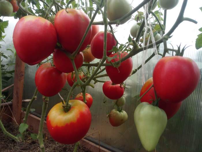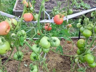 А секретик прост. Во первых сортовые томаты я практически не пасынкую, даже высокорослые. Мне ж не нужны помидоры с мою голову. У меня много крупноплодных сортов, но крошить в салат половинку помидора мне не нравится. Я оставляю 4 пасынка- 2 под первой кистью, 2 над ней. Плоды получаются чуть мельче, а урожай с куста значительно больше. Макушку отсекаю в конце июля, и тогда растение все силы пускает на уже завязавшиеся помидорки. И тогда - урожай только успевай собирать. А во вторых над грядками с томатами я делаю крышу из спанбонда, и тогда никакой росы и соответственно никакой фитофторы.
