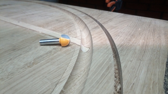 Фрезером, с помощью самодельного циркуля, вырезаю внешний край, внутренний полукруглый кант, и выбираю массу до нужной глубины