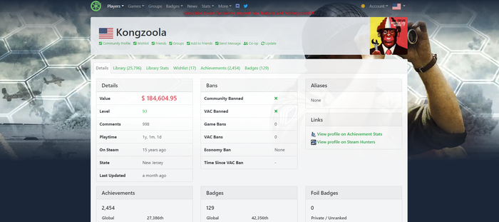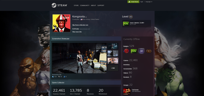 после февральской Kongzoola перешел границу в 26 000 игр (тем самым заняв первое место в рейтинге Steam по числу купленных игр), а сейчас (видимо устав от гонки за иконками), он удалил все их, оставив для себя всего 359 игр