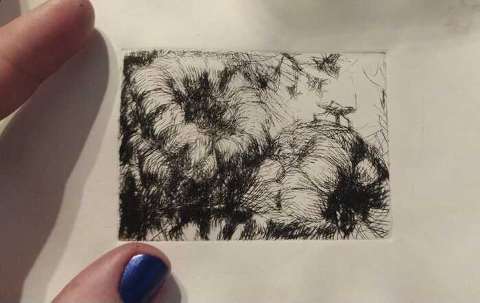 Ещё давно в 2022 меня занесло на мастер-класс по печатным техникам. А если быть точнее, то это был офорт в технике "сухая игла". Старые мастера гравировали пластины для печати на мягком металле, но время не стоит на месте - сейчас на оргстекле прекрасно выполняются такие вещи. После того, как рисунок выгравирован на пластине, ее покрывают типографской краской, снимают лишнее, чтобы краска осталась лишь в углублениях от штриховки и затем печатают оттиски. Мастер-класс был чудесный. Однако, привыкнув работать чистеньким руками, я была в шоке от всей этой возни с типографской краской, от натирания пластинки обрывками бумаги с целью убрать лишнюю краску. Довольно грязные делишки. Очень интересно, но ничего не понятно но это не моё - решила я. Потом, наверное чтобы убедиться что вот прямо точно не моё, я пошла ещё на один мастер-класс. Ладно вру, на несколько. Потом шаловливые мои ручки потянулись к линогравюре. Ну так, только попробовать. На этот новый год дедушка Мороз принес под ёлочку ручной печатный пресс. И это конечно не офортный станок, но чем черт не шутит, а вдруг получится на нем "сухую иглу" печатать, подумала я. Видела, что у некоторых получается. И настало время экспериментов. Первый образец, очень маленький (буквально пяти сантиметровой ширины картинка) вышел удачным в плане качества печати.