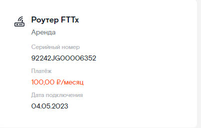 3 месяца я не знал проблем, как вдруг мне пришел счет за интернет. Удивление было в том, что помимо интернета в счете была аренда оборудования. Удивившись, я зашел в ЛК и действительно - там добавилось оборудование, а именно FTTx модем, даже номер серийный указан. Причем самое забавное - указано что модем мне якобы подключили через месяц, 04.05.