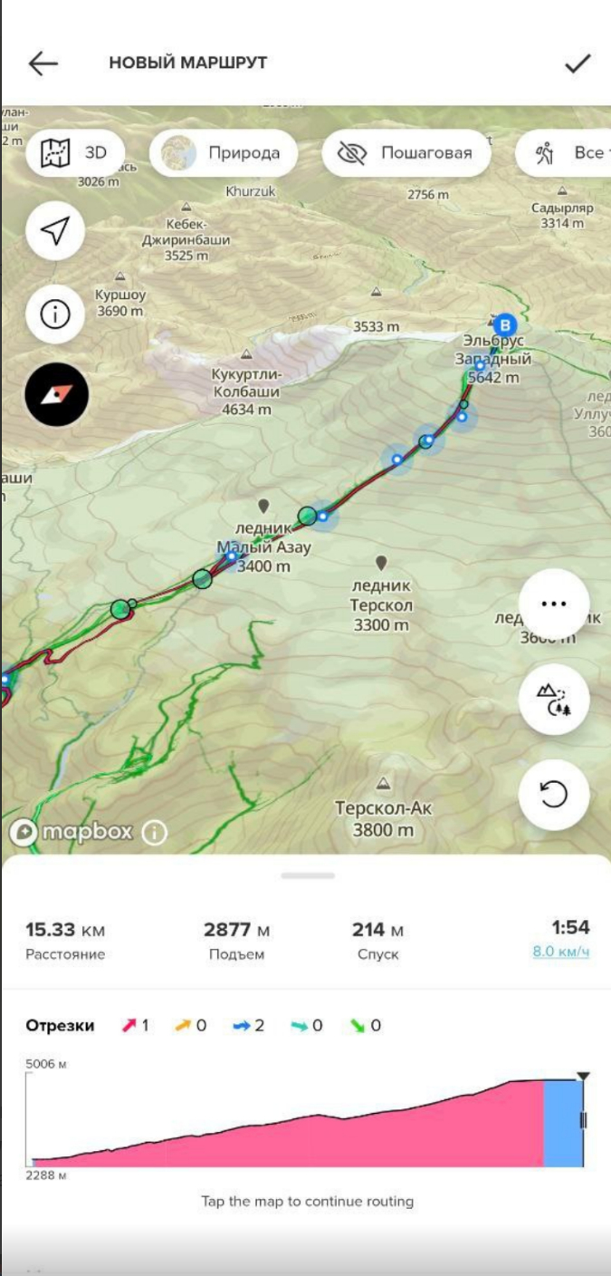 При помощи приложения можно накидать трек до вершины Эльбруса, по чужой тепловой карте за секунд 30, в 3д карте восхитится и пойти уже туда (для этой статьи я сделал это менее чем за 10 секунд, причем большую часть времени двигал карту до Эльбруса).