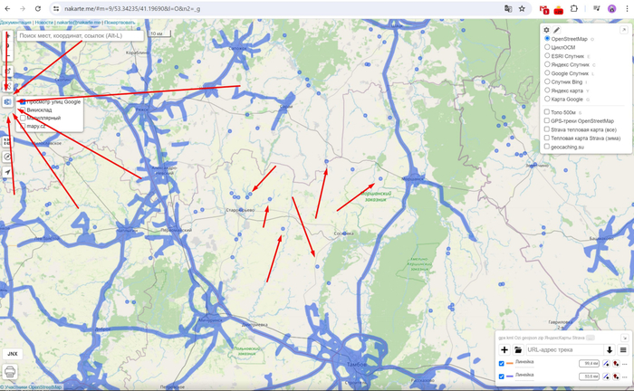 Переходим на лучший сайт для туристов - https://nakarte.me/ и жмакаем слева наверху кнопку с биноклем. И вуаля – мы видим на карте не только просмотр улиц, но и синие кружки в лесу – иногда они бывают очень интересными и теперь мы чуть лучше представляем, что мы можем увидеть (этот прием работает не только на этом сайте, но и отдельно на Яндекс картах, например).