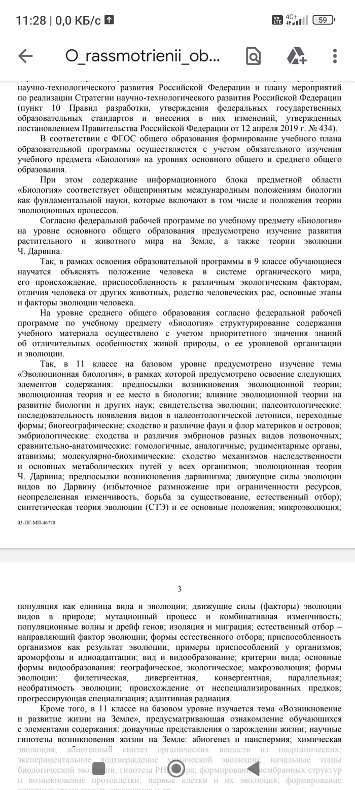Ну а спустя пару недель - пришло письмо из самого Минпросвета. Много бюрократической воды и уверения, что эволюция у нас преподается в полном объеме и запрещать ее преподавание у нас не собираются.