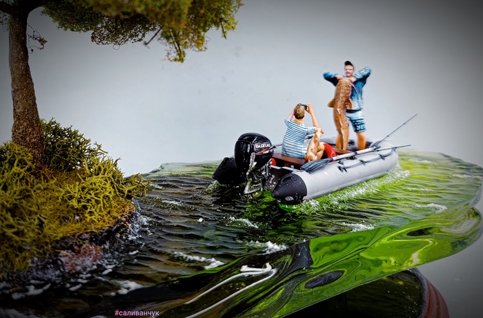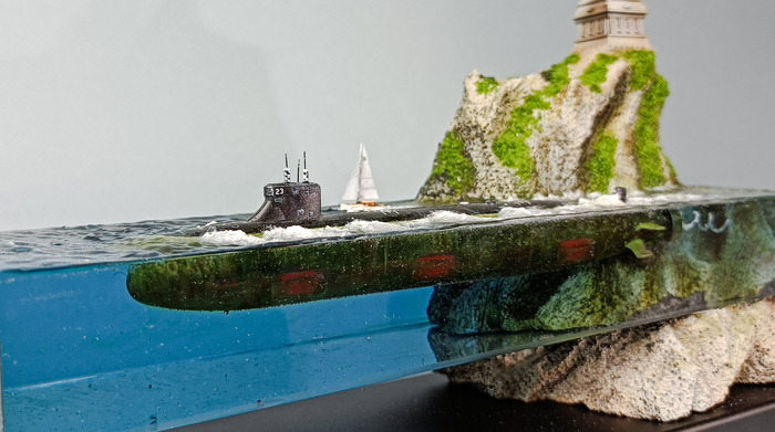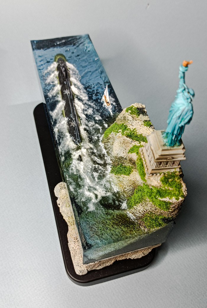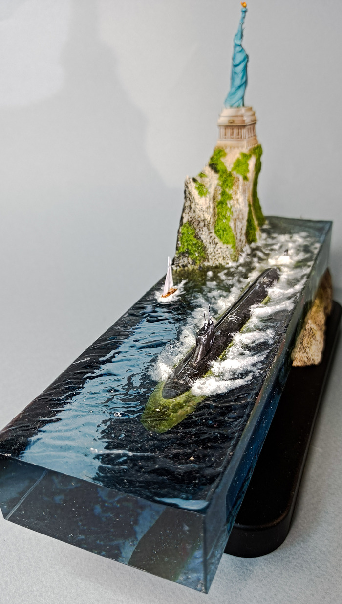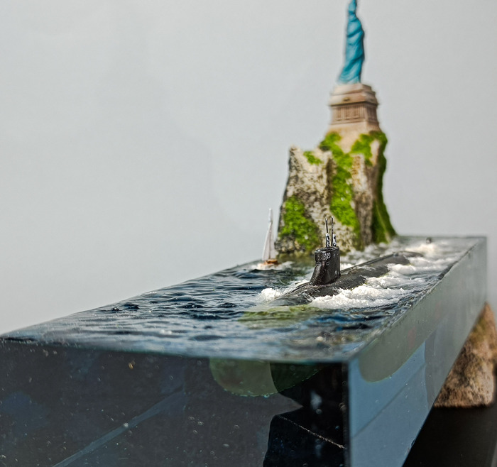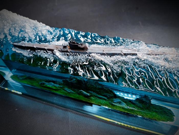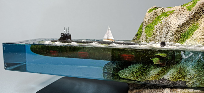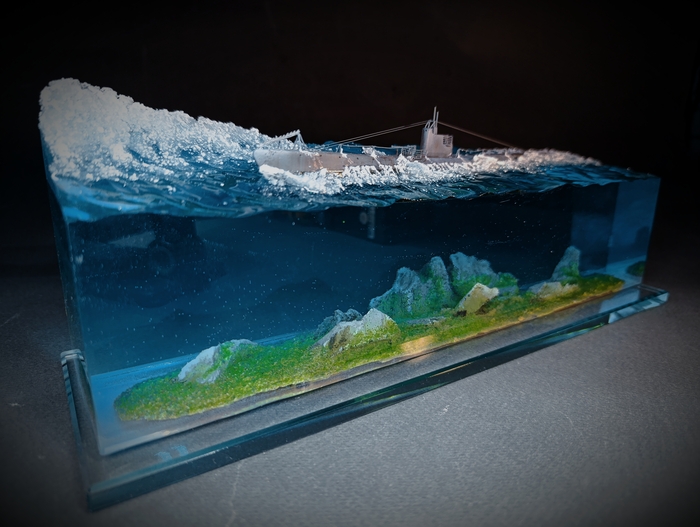 Работа сделана для частной коллекции. Совместно с коллекционером. Онсобрал и покрасил подводную лодку, я погрузил ее в эпоксидную смолу .