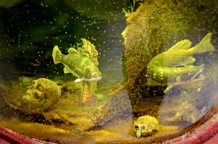 Рыбья мелочь, лягушки, уж, крупный лещ (что б он забыл в такой реке?) и кто-то непонятный крупный, разбегаются в панике по реке, стараясь поскорее спрятаться от монстра.