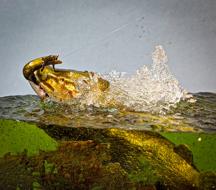 В продолжении его движения, из воды вырываются вверх огромные щучьи челюсти. Речной Монстр пытается отобрать у рыбака добычу. (Или, может быть, он охотится на человека?) Рыбак еще не успевает понять, что происходит, с его места не видно происходящее справа, где за камышом идет волна, а немного дальше, сзади, за деревом, торчит из воды щучий хвост, движением которого она придает себе ускорение. Да и не смотрит рыбак по сторонам, он сосредоточен на том, чтобы вытащить добычу на берег. Подсачника у него нет.