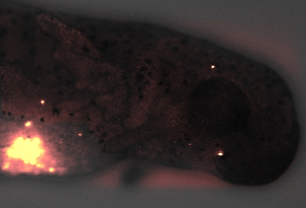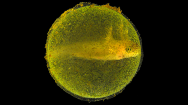 Эмбрион саламандры с большим количеством клеток водорослей внутри тканей. За счет флуоресценции хлорофилла водоросли окрашиваются в ярко-желтый цвет