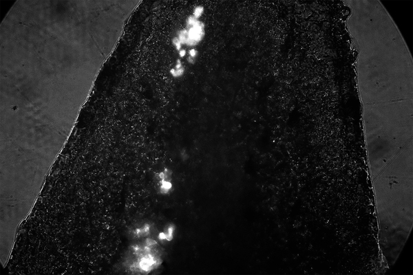Хвост пятнистой саламандры с эндосимбиотическими водорослями. Водоросли визуализируются флуоресценцией хлорофилла, отображаемой как яркие белые области