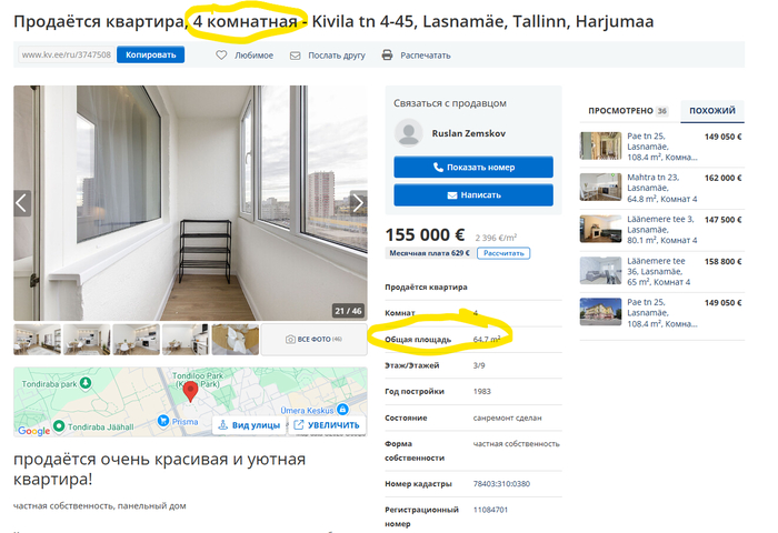 1) Итак начну. В объявлении один адрес Кивила 4, в тексте объявления другой Кивила 13, а 21 и 22 фото показывают, что фотографии сделаны вообще в третьем месте. Кто знает Таллин, понимает, что это в нескольких километрах от улицы Кивила.