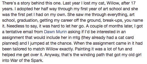 У этой карты своя история. В прошлом году в возрасте 17 лет меня покинула моя кошка Уиллоу. Я приютил ее на первом курсе художественной школы, это был мой первый питомец в жизни. Мы с ней прошли через всё: школу искусств, выпуск, начало моей карьеры, все взлеты и падения. Сами понимаете, какая это огромная потеря. Пару месяцев спустя я получил письмо от Dawn Murin [Senior Art Director по Magic the Gathering] с вопросом, не хотел бы я включить ее в МТГ (у них уже тогда была запланирована карта с котом), и я воспользовался шансом. Я постарался воспроизвести Уиллоу максимально точно. Ее рисование принесло мне много радости и помогло пройти через ее смерть. Вот так моя старушка оказалась в Войне Искры [новое дополнение MTG, выходит в мае].