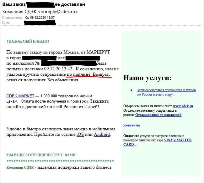 9.12.2020. Я получаю письмо от компании СДЕК: