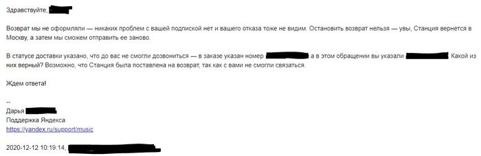 Я ещё ничего не понимаю (хотя до сих пор не понимаю), не придаю значение термину "возврат" в письме, я просто с удовольствием работаю и жду любимую яндекс-станцию.