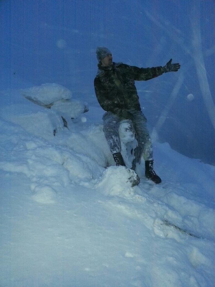 Вернулся я к полуночи, ну а утром мы отправились дальше. Мороз и сугробы уже по колено, а местами и пояс (дальше в такой сезон люди уже не ходили и ничего не чистилось в те дни) буквально с порога жестоко ударили по нашей психике, тем не менее Штепсель и Тарапунька попёрли вперёд! )) Мы яростно и дерзко проходили.............. около ОДНОГО-ДВУХ километров в час... ;))) В следующий приют пришли около трёх, скинули рюкзаки, поели и тут же отправились покорять ближайшую высоту!! Путь тяжек и не близок, поэтому сумерки застали на полпути к вершине и заставили вернуться обратно в лагерь... Была затоплена печь (охапка дров - 100 руб.))), развешены над печью вещи, приготовлена еда и заварено кофе... Под треск дров и романтику приключения Сане (мне) вдруг навязчиво захотелось целоваться, о чём я незамедлительно оповестил свою спутницу, на что получил решительный отказ... Неприятная ситуация, далее общение было переменно натянуто...