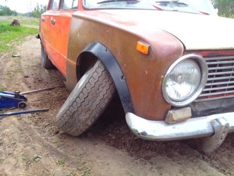 В машине, о предусмотрительность, среди инструмента была проволока. Стабилизировали колесо проволокой, проехали несколько километров - порвалась, колесо стало совсем не похожим на колесо, поставили запаску, опять проволокой... Пара километров, уже асфальт и деревня! бух! Запаска лопается.