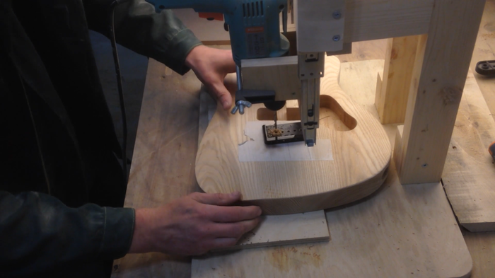 Настало время делать полости для звукоснимателей и органов управления. Схема прежняя — копировальной фрезой фрезеруем по шаблону.