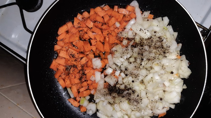 Обжарили мясо (килограмм у меня за три раза, по три минуты) бросаем лук и морковку, следом чёрный перец, тут кому как угодно, я малек давлю его