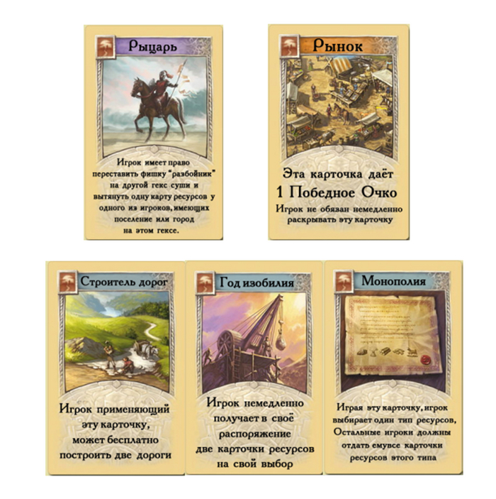 В игре 3 вида карт развития: Рыцари, Здания и Карты прорыва.