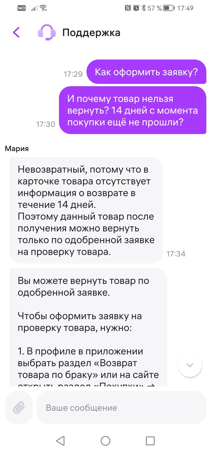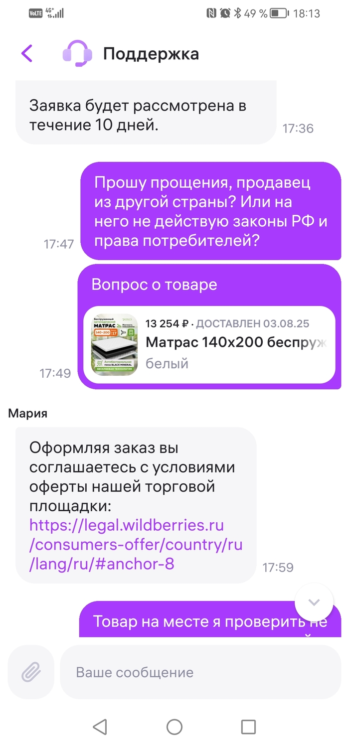 Ответ продавца и оспаривание вопроса возврата. Заявка была отклонена, вайлдберис согласен с продавцом. Ладно, фиг с ним, разные матрасы, не брак. И как теперь вернуть, ведь товар не продовольственный и проблем больших быть не должно. Ага, тут маркетплейс превосходит себя (по моему мнению, я офигел от ответа).