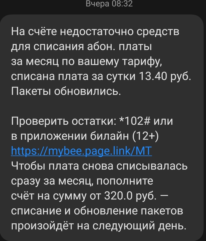 Приходит SMS в конце месяца, пополните баланс, денег недостаточно для списания абонплаты. По наивности я пополняю баланс, и вуаля, денег для абонентской платы так же нет. лезу смотрю, 300 руб как корова языком. В чате отвечают, мы ничего не знаем, это всё вы подключали. Прошу отменить, мне пишут отменить можем, но деньги вам не вернём, Спасибо что вы остаётесь с нами. В Яндексе тоже говорят, типа мы не в курсе, это всё Билайн.