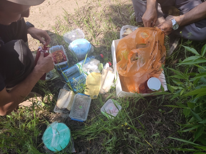 Потехе время, как говорится, вот и обед) Кушаем без затей, на земле/траве. Когда на базе (бригаде, по-нашему), то в столовой