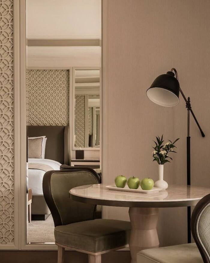 Внутри есть всё, что ожидаешь от люксового отеля: несколько ресторанов, панорамные лаунжи, открытый инфинити-бассейн на верхних этажах и спа с видом на Dubai Marina. Отдельного внимания стоит sky terrace, где город раскрывается на 360 градусов