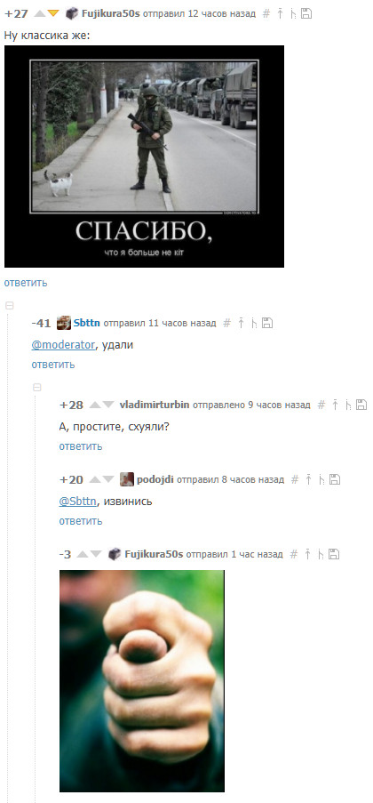 Отака хуйня, малята. "Спасибо" руководству сайта не за коммьюнити, но за правила, что не наказывают, а поощряют вот такое поведение. Я понимаю, что на Пикабу много любителей дерьма политоты, но когда любитель клубнички постит еротику в пост с котом, модератор его трёт, пусть это и не радует наше коммьюнити в своём большинстве.