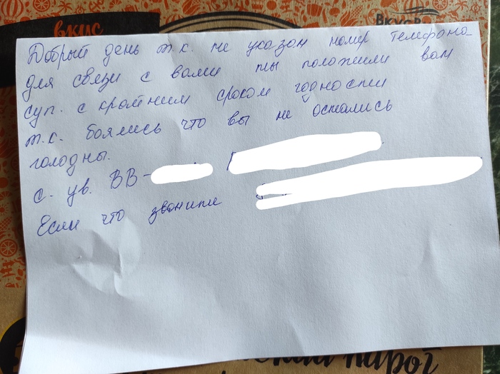 Через нское время прибегает курьер, беру заказ, иду терроризировать пакеты с едой. И нахожу на дне одного из пакетов бумажку: