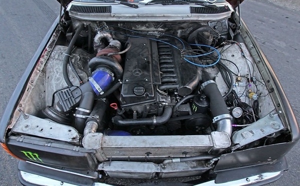Турбина Holset HX52, установленная на самодельном выпускном коллекторе, выдает давление в 3 бара, а иногда, в зависимости от дороги и ситуации, до 3,5 бар. Неповторимое звучание Бенцу придает клапан сброса избыточного давления, управляемый буст контроллером.