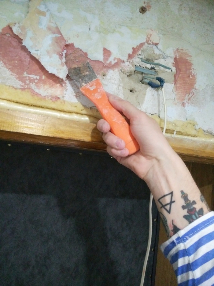 Нет, говорит,обои хочу весёленькие,с цвятошками. Ну не вопрос ,сделаем. После демонтажа панелей пред нами оказалось вот такое жестилово